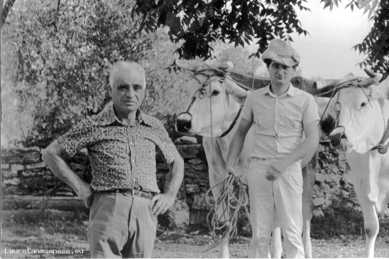 Il Chiodini, agricoltore appassionato del proprio lavoro, è ritratto assieme al figlio Claudio, attuale gestore con il fratello del Consorzio Agrario, e due magnifici esemplari di razza chianina, aggiogati.