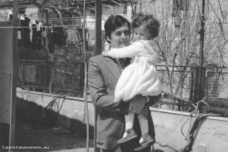 Bella immagine di un babbo: Enzo Magini, orgoglioso di tenere in braccio la propria figlioletta: Annarita.