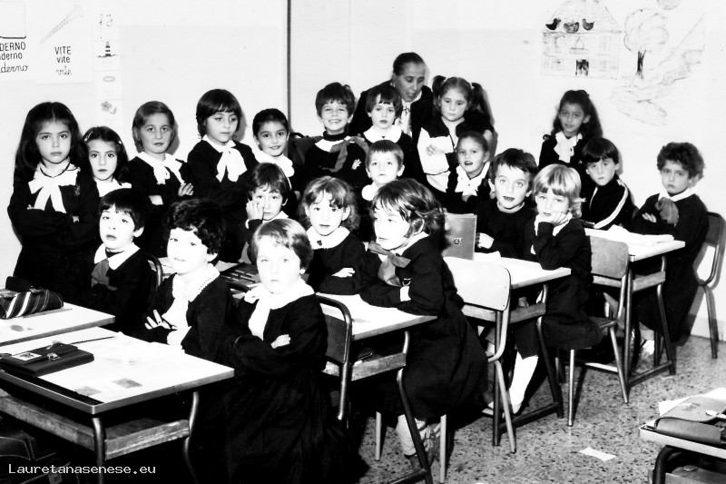 Bella foti della 1^ elementare della maestra Rosaria Pes, composta da bambini e bambine nati nel 1975.