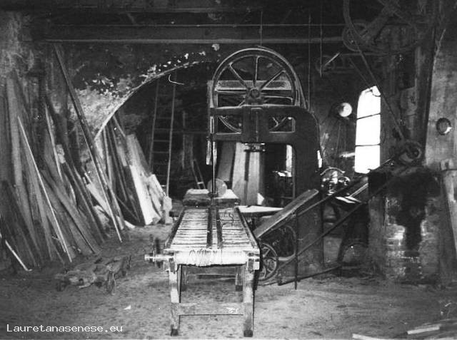 la grande sega a nastro per ricavare tavole direttamente dai tronchi d’albero e il tornio a legno, collocato sotto la finestra ed utilizzato per la tornitura dei mozzi delle ruote da carri.