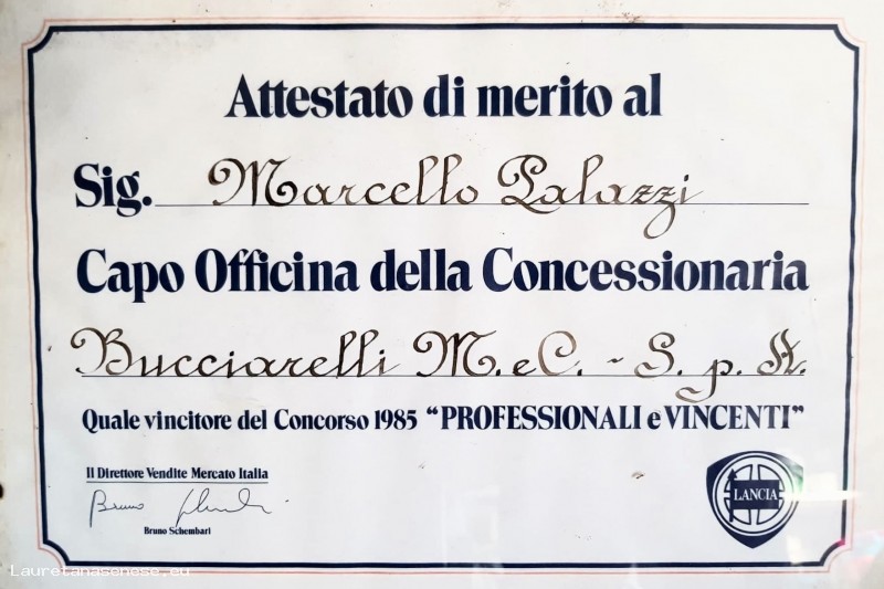 Tutti conoscono la passione di Marcello Palazzi per i motori e il fatto che, di questa passione, è riuscito a farne un mestiere per tutta la sua vita lavorativa, ma questo attestato di riconoscimento di: miglior tecnico della Toscana, dimostra l'alto livello di professionalità che è riuscito a raggiungere.