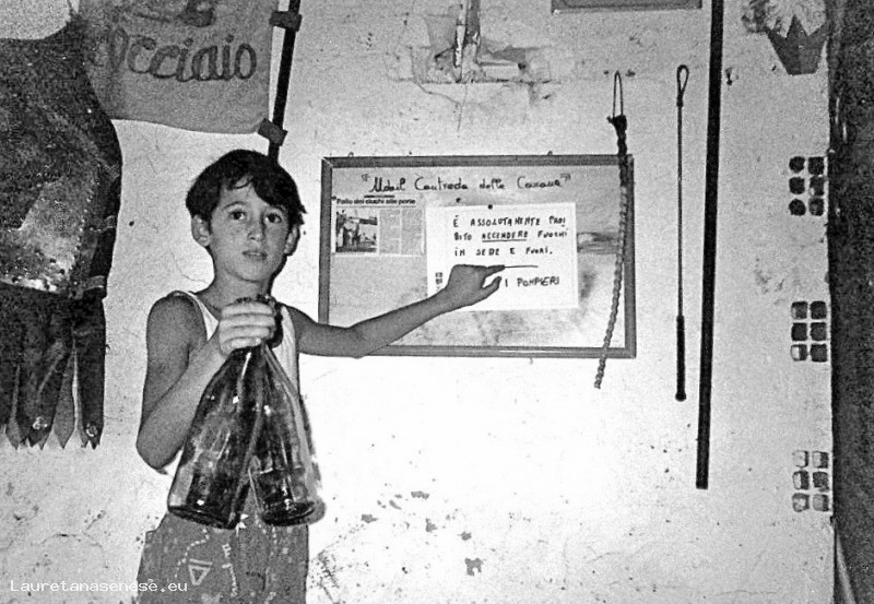 Il ragazzino con le bottiglie vuote in mano, che indica il divieto di accenzione fuochi, affisso al muro della sede della Contrada, è Francwsco Roncucci, detto Scrich.