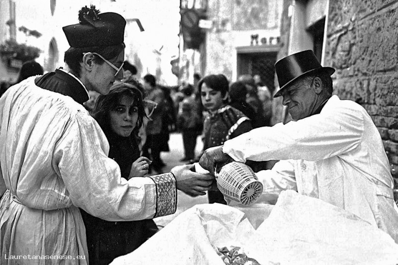 Bella foto di un particolare dell'evento carnevalesco, l'offerta dei tradizionali crogetti, tipici dolci del periodo, e del Vinsanto nel fiasco.