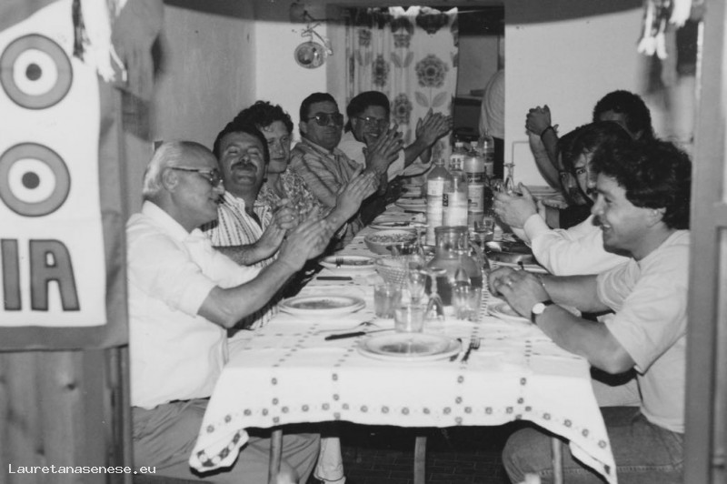 Nella foto, il pranzo con gli amici, organizzato nel garage di casa di Piero Moscatelli, proprietario del bar. Piero, che per l'occasione si è prestato a fare il cuoco, cucinando per tutti.