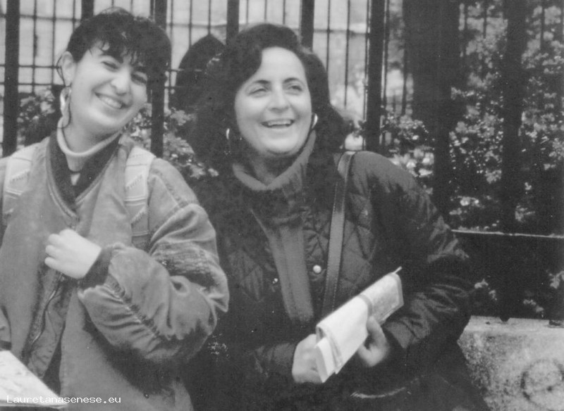 Miranda Fedi con la figlia Paola Romi ritratte davanti alla cancellata dell'Università Parigina della Sorbona.