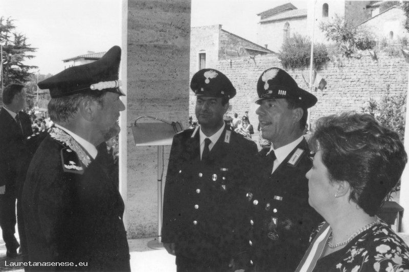 Foto scattata all'ingresso della caserma dopo la cerimonia, che ritrae il generale dei carabinieri a colloquio con il sindaco Franca Mariotti e due militari locali, uno dei quali è Sassano.