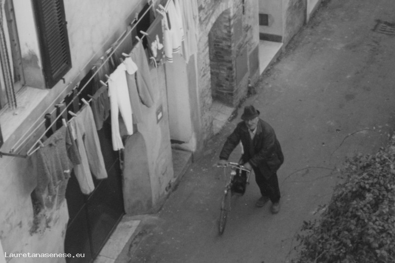 Ilveno Moscadelli, al rientro in bicicletta dalla vigna, mentre percorre via Santa Maria.