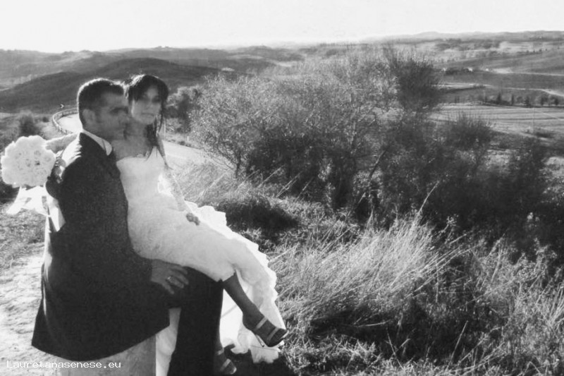 Gli sposi dpo la cerimonia in chiesa seduti sulla collinetta lungo la Lauretana Antica, impegnati a godersi insieme il magnifico paesaggio di Leonina: Paolo Bonari Laura Latini