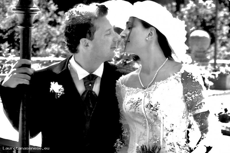 I due sposi fotografati subito dopo la cerimonia religiosa, nel giardino del castello di Serre. Gli sposi: