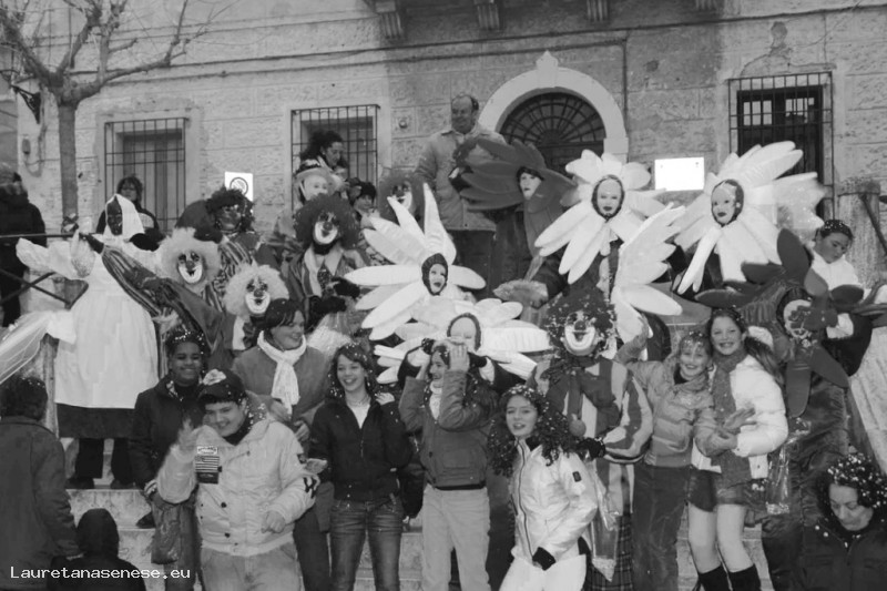 Bella foto di gruppo composto da maschere e persone che festeggiano il Carnevale in piazza Garibaldi.