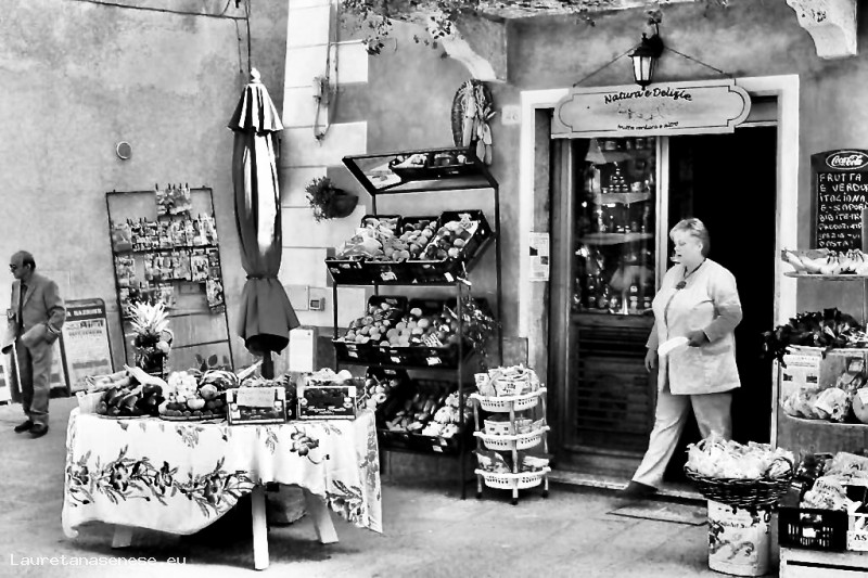 Nel giorno in cui Giuliana Centini ha ceduto il negozio a nuovi gestori, la vogliamo ricordare con questa immagine con la "spolverina" in mezzo ai suoi buoni prodotti offerti.
