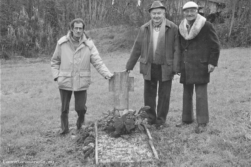 Un parente e due amici in visita alla tomba di Azelio Laschi, vicino ai Bagnoli, oltre la ferrovia, dove fu sepolto a seguito della sua uccisione per mano dei tedeschi.