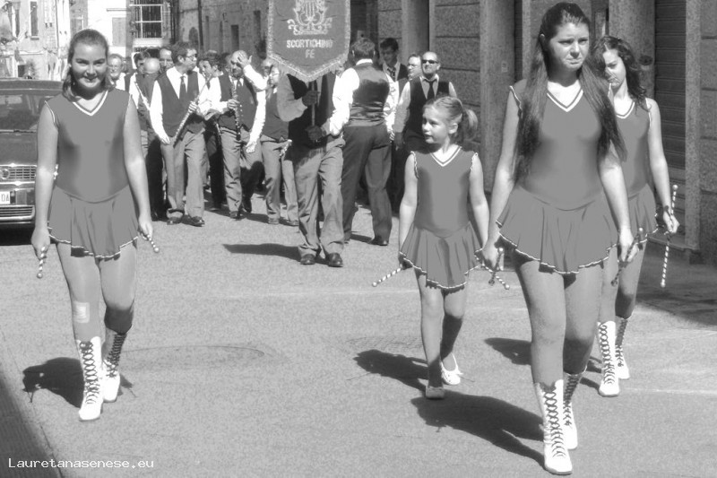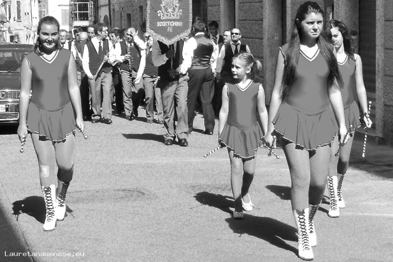 Le Majorette della locale Filarmonica accompagnano la banda ospite di Scortichino, Ferrara.