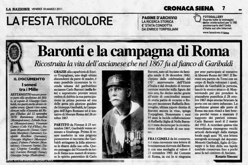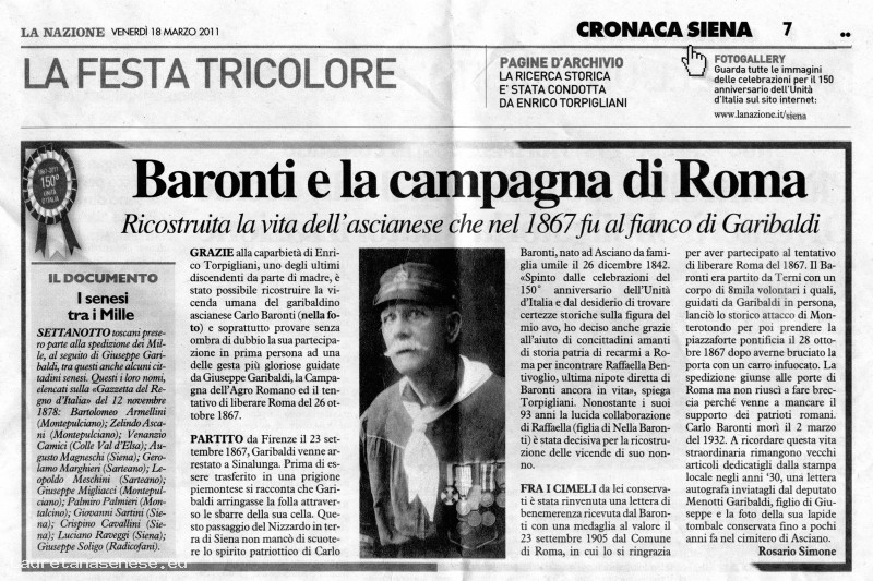 Nel 150° dell'unità d'Italia (17 marzo 1861), è stata ricordata la storica figura di Carlo Baronti, volontario garibaldino ascianese.