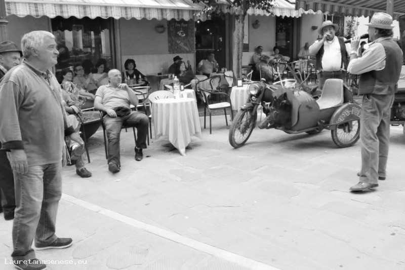 Una coppia di musicisti folk, arrivati in moto corredata di "side car", si esibiscono in piazza, davanti al Bar Hervè.