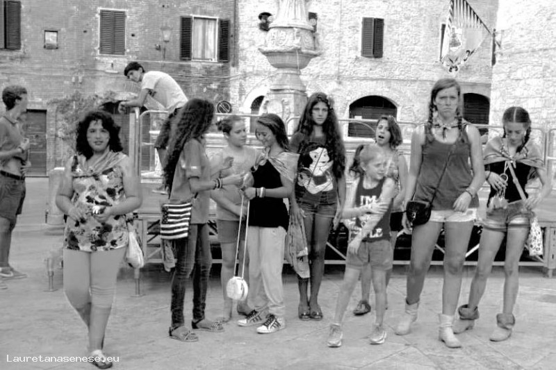 Un gruppo numeroso di citte e cittine radunato accanto alla fontana nei giorni di settembre precedenti il Palio dei Ciuchi.