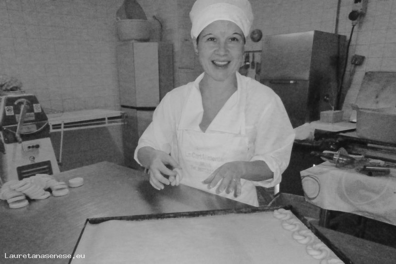 Una delle collaboratrici del Forno delle Crete mentre prepara i pasticcini da infornare.