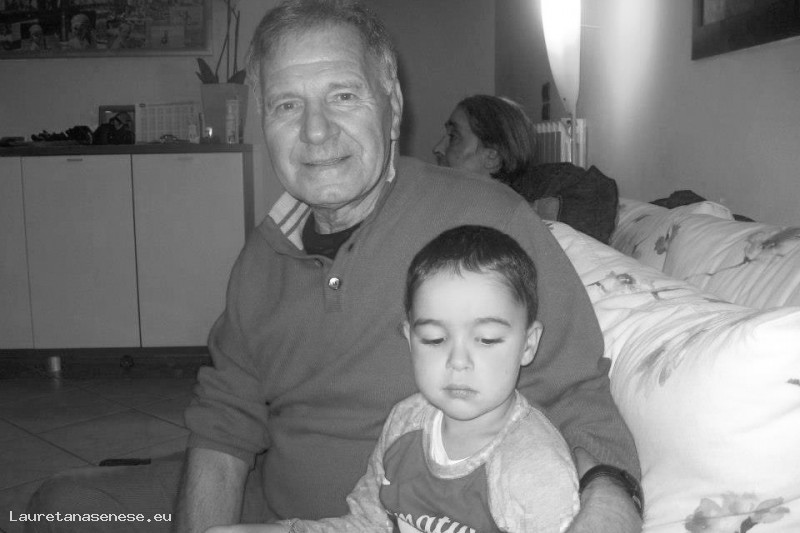 Bel ritratto di Franco Fregoli seduto sul divano di casa accanto al nipotino Matteo Gallorini, figlio di Laura, la primogenita che vive ad Arezzo.