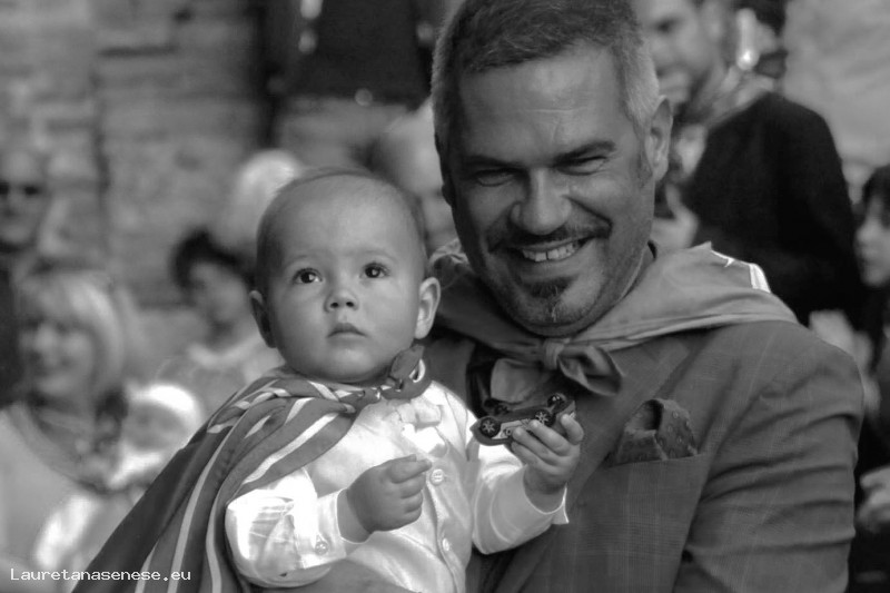 Andrea Degortes, figlio di Alberto, partecipa al battesimo contradaiolo nel rione dell'OCA, in braccio allo zio Antonio.