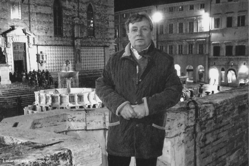 Foto notturna di Gianfranco Fratagnoli nella piazza 'principale del centro storico di Perugia. Luogo caratterizzato dalla famosa fontana che si vede alle sue spalle.