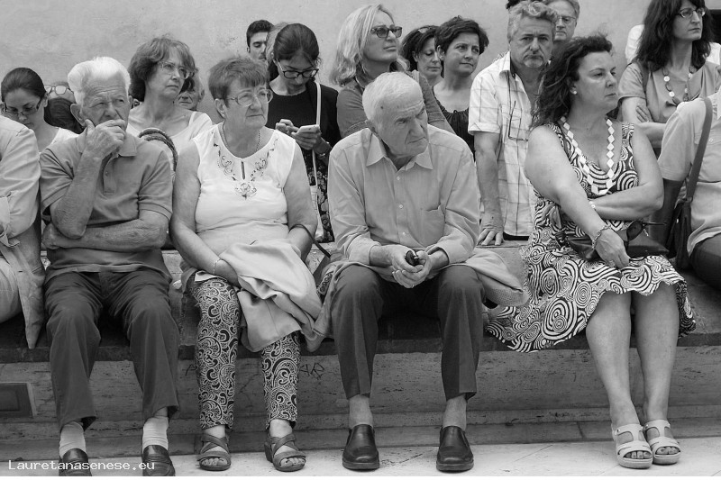 Qui li vediamo insieme a Divo Savelli, la moglie e altre persone note, mentre assistono ad un evento che si sta svolgendo nel giardinetto di Sant'Agostino.