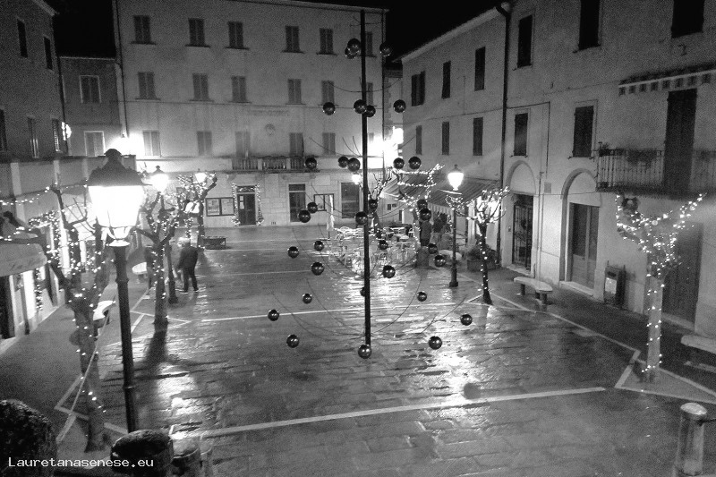 Foto surreale di una piazza deserta per il mal tempo ma arricchita con le luci delle feste e un albero di Natale veramente originale.