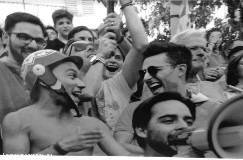 Antonio Deriu detto Pampero, fantino della contrada del Prato, circondato dai contradaioli festanti, immediatamente dopo aver tagliato il traguardo.