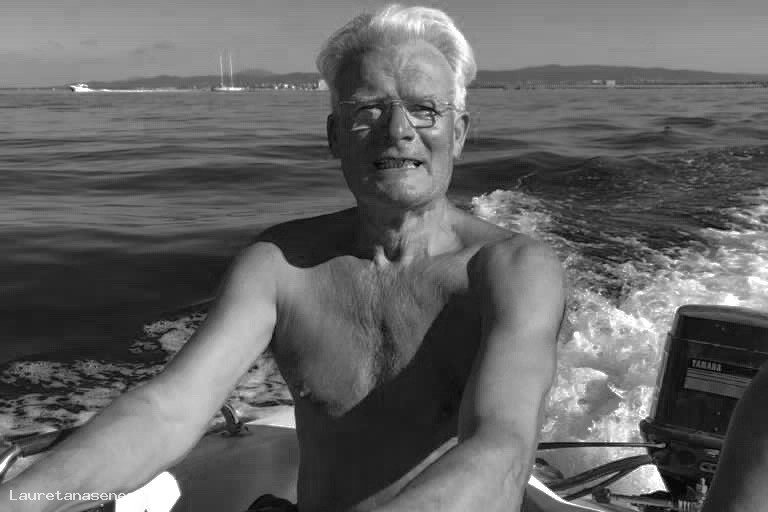 Bella foto di Spartaco Sani alla guida di una piccola barca con motore fuoribordo.