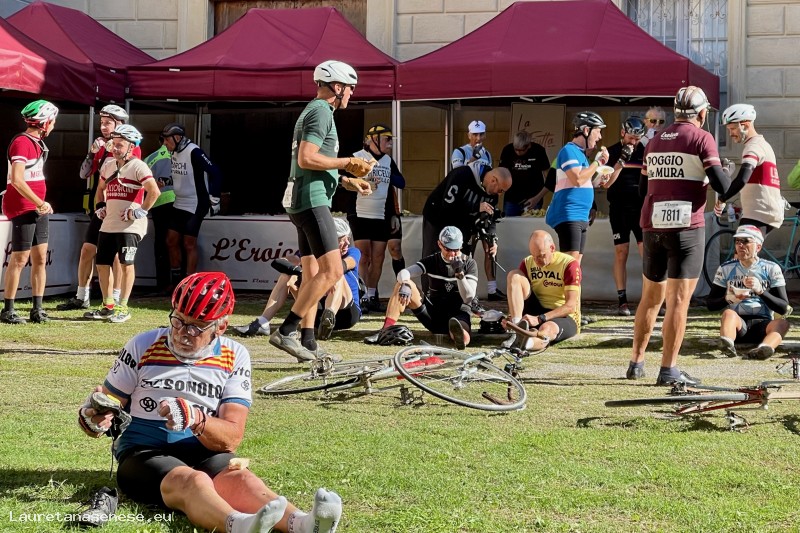 Il ciclista dell'Eroica in mezzo alla foto, approfitta della sosta di Asciano per togliersi le scrpe e controllarle.