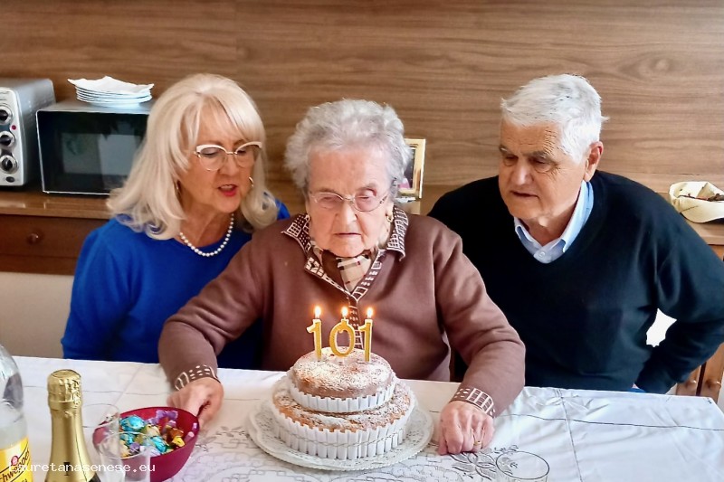 Elena Ciacci, coniugata Bonari, è arrivata in buono stato di salute ai 101 anni e festeggia serenamente con i due figli, davanti ad una bella torta.