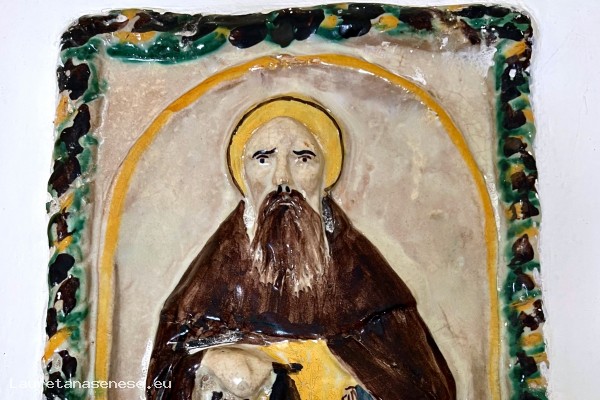 Come si evince dalla foto, si tratta della raffigurazione di Sant'Antonio Abate, notoriamente considerato protettore degli animali.Anche questo bassorilievo invetriato non è di particolare pregio dal punto di vista artistico, ma testimonia la consuetudine locale a manifestare venerazione per il santo nel mondo contadino di un tempo.
