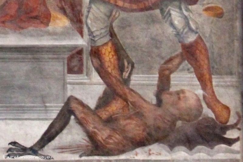 Still on the lower left side, there is a small kneeling figure, depicting an Olivetan friar. This representation and its small size would indicate that the fresco was painted on an Olivetan commission, probably at the same time as the cycle of frescoes by Sodoma, dedicated to the life of Saint Benedict, between 1505 and 1508. they can still admire inside the main cloister of Monte Oliveto.