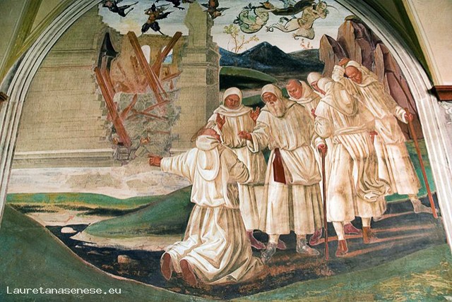 On the left is the home of Florenzo destroyed by the devil, the devil is in the sky away after stealing his soul. In the foreground St. Benedict that monks inform Fiorenzo died under the rubble of his house.