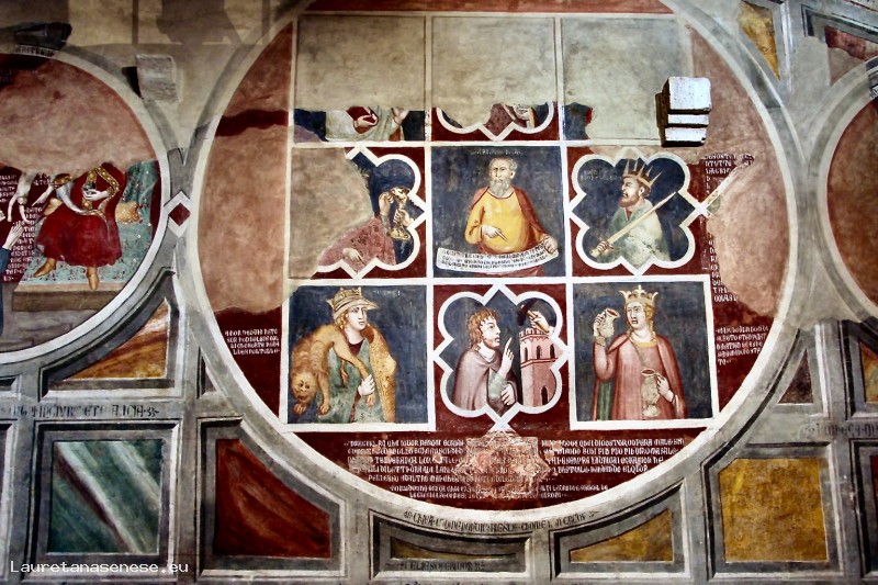 The room, located on the first floor of the building, is among the works of enlargement of the building carried out at the turn of the thirteenth and fourteenth centuries. The great room, which was probably used to study commercial and administration of local justice, presents a colorful decoration faux marble accompanied, in the upper part of the walls, a rich sequence of coats of arms. Within this system decorative decorative, fit three large medallions with figures: Round of Aristotle - The largest of the three paintings on the north wall of the room, is the starting point of the illustration illustrations. There stands a half-bust of Aristotle, identified by a cartouche with. The picture is surrounded by the four Cardinal Virtues (Prudence, Justice, Fortitude and Temperance) and four sides by historical or mythical figures who, in their stories, are an example of the virtues themselves. These are now seriously damaged as well as most of the inscriptions. In quatrefoil below, is depicted a man pointing a hand ax and regent in the background a tower. SSI is certainly a symbolic reference to the town of Asciano. The scene as a whole is intended to enhance the common good that should be the main goal of those who manage the power, as Aristotle teaches, and that is achieved by good behavior, especially in terms of justice. Round of Solomon - The medallion to the left of the "Round of Aristotle" depicts the biblical story of the Judgment of Solomon, enlightened by divine wisdom. The scene shows two mothers who had given birth on the same days and lived in the same house, and that, following the death of one of the two children, they accused each other of having exchanged their dead son live with. Solomon, to prove who the real mother would have divided in half with his sword the child is depicted identifies the natural mother, recognized that in order to save his son, he asks the king to hand begging the other woman. Round of Nebuchadnezzar - Ilprimo Dream of Nebuchadnezzar, narrated by Daniel the prophet, is rappresentatoAlla the right of the "Round of Aristotle." The episode, from the Old Testament, showing what appeared to the king in a dream: a large statue with the head of gold, chest of silver, its belly and thighs of bronze, its legs of iron, its feet partly of iron and partly of clay, is destroyed by the fall of a large boulder. Nebuchadnezzar was troubled by a dream, he summoned all the wise men of Babylon, and condemned them to death because they are unable to interpret the meaning of the dream. Only Daniel, was able to explain to the king that the dream anticipated the fall of his kingdom and the coming of the Kingdom of God in this sense, the Dream wants to mean an example of Christian condemnation riches and greed of those who govern, because destined to an inexorable fall. The iconographic representation continues into the east wall with a spectacular classical Rota Barlaam.