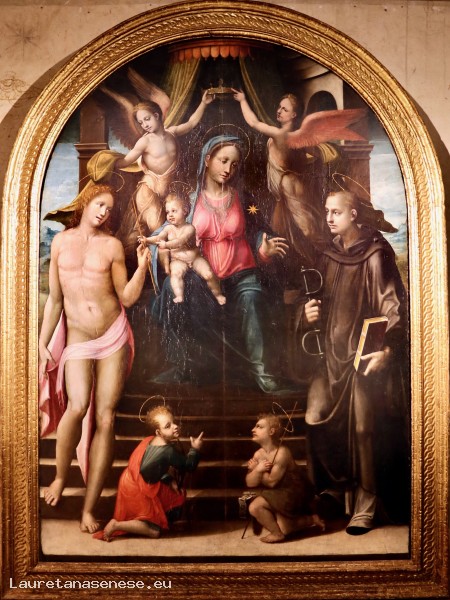 Riccio structured the scene with circular lines and rhythms, with the Madonna in a perfectly central position, seated on the throne hidden by the abundant draperies. The Child, typically Riccio, hands the spear to Saint Sebastian, while Saint Leonard, wearing a monk's habit, holds the book in one hand and the chains in the other, a symbol of his protection for all those unjustly imprisoned.