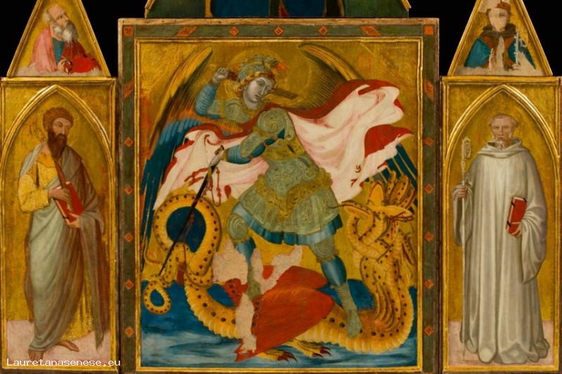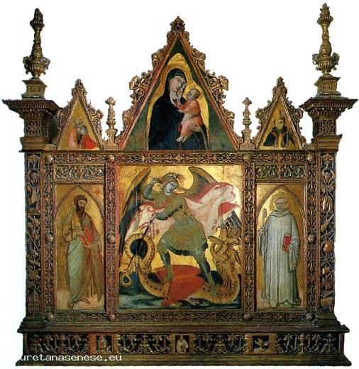 The triptych depicts St. Michael the Archangel slaying the dragon and the Saints Bartholomew and Benedict. The work comes from the nearby Badia a Rofeno and was created by the renowned author of the frescoes of the Sienese painter Governance in the Public Palace of Siena, perhaps at different times.