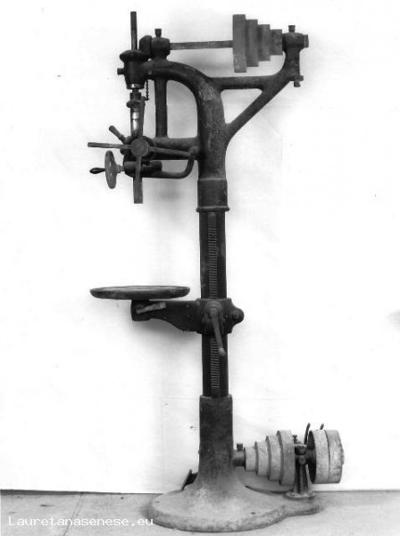Questo trapano, ancorato direttamente sul pavimento della bottega, potefa essere usato su oggetti di grandi dimensioni, semplicemente regolando ol piano d'appoggio.Il moto gli era trasmesso attraverso un collegamento a cinghia con pale alimentate da salti d'acqua e , solo successivamente con un grosso motore elettrico trifase che attraverso barre aeree di trasmissione forniva forza motrice a tutte le macchine operatrici di una bottega.