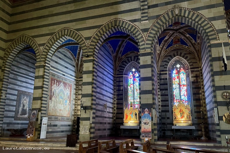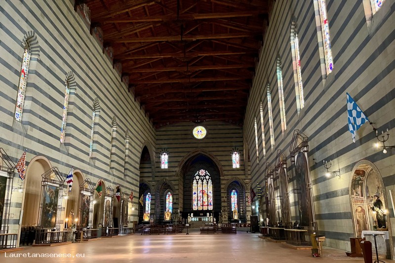 All'interno, in controfacciata si conservano i resti di due sepolcri trecenteschi e, in alto, due grandi affreschi frammentari staccati rispettivamente da Porta Romana e Porta Pispini e in prossimità della controfacciata è il quattrocentesco portale di Francesco di Giorgio Martini, originario della facciata. Nel lato sinistro della navata si incontra una Crocifissione di Girolamo di Benvenuto, seguita da sei pale ricollocate recentemente. All'inizio del lato destro della navata è presente la lunetta con una Visitazione degli inizi del Quattrocento, cui seguono tre tele, la Predica di San Giacomo di Giuseppe Nicola Nasini, la Natività della Vergine di Giovan Battista Ramacciotti e la Resurrezione di Lazzaro di Alessandro Casolani e Vincenzo Rustici. Oltrepassato il frammentario sepolcro trecentesco della famiglia Tolomei, giungiamo nel transetto destro dove si trova la cappella in cui sono venerate nel periodo invernale le "Sacre Particole", ostie rimaste miracolosamente incorrotte dal 14 agosto 1730, giorno in cui fu trafugata la pisside che le conteneva; le stesse furono rinvenute nella collegiata di Provenzano. La cappella è decorata sulla sinistra da un finto polittico con la Madonna col Bambino e Santi affrescato da Lippo di Vanni. Nella parete di fondo del transetto destro si trova il marmoreo San Francesco degli inizi del XIV secolo proveniente dalla facciata della chiesa. Oltrepassata la cappella centrale che ha l'altare maggiore di Leopoldo Maccari e Giuseppe Partini, si accede al transetto sinistro, ove proseguono le cappelle absidali. L'ambiente successivo ospita la Madonna col Bambino affrescata da Jacopo di Mino del Pellicciaio. Il transetto sinistro comprende inoltre altre due cappelle, in una delle quali si conservano le "Sacre Particole" nel periodo estivo. Le originarie forme architettoniche di tale luogo, dovute a Lorenzo di Mariano, sono state restaurate nell'Ottocento.