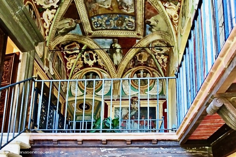 The Library room, commissioned by Abbot Francesco Ringhieri in 1515, was designed by his brother fra Giovanni da Verona, who also sculpted the capitals in pietra serena, carved the entrance door, the cupboard for the choirs today on the wall of background and the large wooden candelabra from 1502, placed in the middle of the room for lighting.