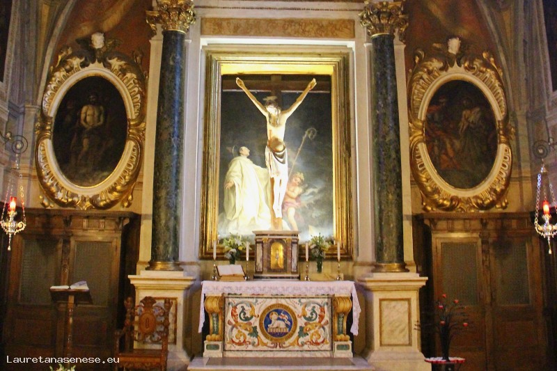 The high altar, located in the central apse of the church, is flanked by two minor altars inserted in two side niches.