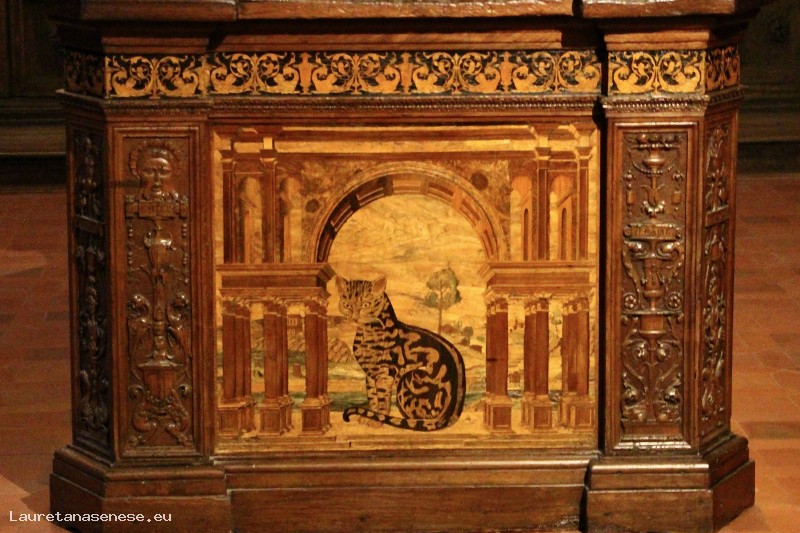 Finally, the two side walls of the Gothic hall are completely occupied by the inlaid wooden choir where, even today, the friars take their places during the daily religious services.