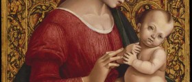 L'estrema dolcezza dell'espressione della Vergine che fa di questo uno dei volti più belli mai dipinti da Luca Signorelli rimane a memento dell'amore del pittore per sua figlia, Gabriella. La tavola venne infatti donata nel 1507 da Luca all'unica figlia ancora in vita e la descrizione precisa che ne viene data nel documento rintracciato nell'archivio di Stato di Firenze permette l'identificazione del dono con quest'opera di New York. Databile tra il 1505 e il 1507, grazie a confronti stilistici con opere di questo periodo, la tavola è l'unica nel catalogo di Signorelli ad avere uno sfondo così elaborato. Il fondo oro viene quasi graffito ad ospitare i profili di due imperatori romani (Domiziano a sinistra e Caracalla a destra) e numerosi putti in pose e gesti diversi. Roger Fry ipotizzò che potesse trattarsi di un “corame”, cioè di una decorazione parietale realizzata con pelle dipinta e stampigliata che veniva usata per ricoprire le pareti delle sale più importanti di eleganti dimore. Ancora oggi il significato e l'eventuale simbologia di questo sfondo rimangono un enigma non risolto. Il legame tra i due protagonisti è sottolineato dal gesto affettuoso della Madre che sembra quasi cercare le mani del Figlio intento invece a ritrarre il braccio destro e a guardare fuori dal quadro a prefigurare la sua fine.