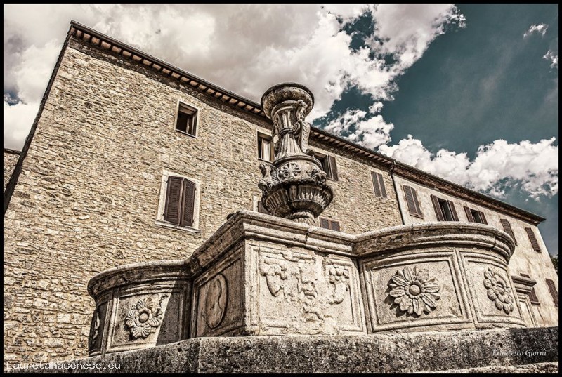 Located in what was then the mercantile center of town, this magnificent fountain was sculpted by the Renaissance artist Antonio Ghini in 1465. The outer portion of the basin is divided into rectangular panels decorated with designs of plants and various allegorical figures. In the middle of the basin there rises up a tall jug out of which the water spurts. The jug sits on a triangular base displaying the coats of arms of the two powerful men who had the fountain built: Palmieri and Nanni.