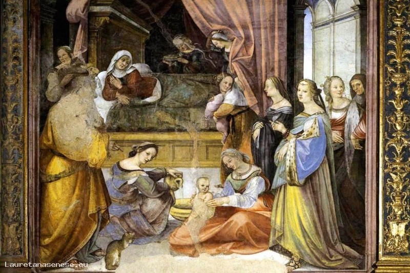 The fresco measuring 248 x 194 cm, is complemented by grotesque grooved wooden skirts.