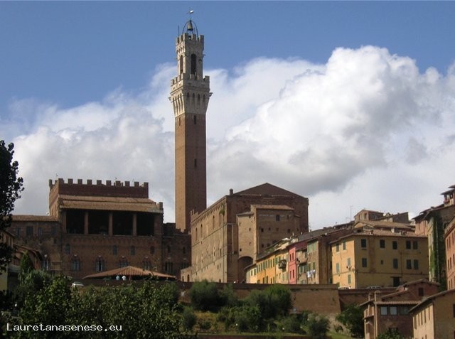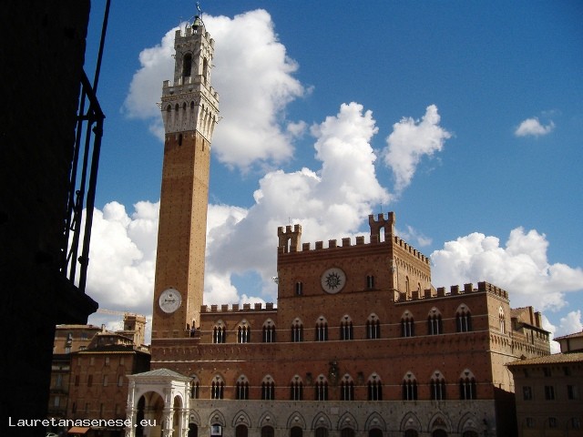 Il Palazzo Comunale di Siena (detto anche Palazzo Pubblico) è il palazzo costruito dal governo della Repubblica di Siena agli inizi del XIV secolo come sede del Governo dei Nove della città toscana. Il Palazzo Pubblico sorge sulla piazza del Campo ed è affiancato dalla snella Torre del Mangia. Venne costruito tra il 1298-1310. In questa costruzione non è usata la pietra, ma il mattone. Gli elementi bianchi sono in marmo. Sono presenti merli guelfi. I due corpi laterali furono rialzati successivamente. Ha uno sviluppo longitudinale. Ogni finestra è ornata da un’ogiva che la contiene. I fori presenti su tutta la struttura servivano, un tempo, per le travi per realizzare ballatoi all’esterno. Negli anni successivi al 1193, anno in cui si ha notizia della suddivisione di Piazza del Campo dallo spazio che diventerà piazza del Mercato, dove ora si trova il Palazzo Comunale viene costruito il "Bolgano", zecca della Repubblica di Siena, e la dogana. Non toglie dunque che il palazzo è fortemente legato all'arte gotica e questo lo notiamo grazie all'architettura. Fino al 1270, con il Governo dei Ventiquattro, il governo della città aveva sede nella curia della Chiesa di San Pellegrino. Il Consiglio della Campana, composto dai nobili e così chiamato perché si adunava al suono della campana maggiore posta allora su una torre della famiglia dei Mignanelli, aveva come luoghi di riunione principali tre specifiche chiese e aveva le proprie sedi nei palazzi dei nobili. Caduto questo governo degli aristocratici, con il governo dei Nove si comincia a pensare a una sede "neutra" per il governo della città. Nel 1284 si ha notizia di un primo nucleo di quello che sarà il Palazzo Comunale. Alla salita al potere del Governo dei Nove, nel 1287, la costruzione del palazzo ha la spinta definitiva. Mentre il palazzo del Bolgano era rivolto verso l'attuale piazza del Mercato, il nuovo palazzo guarda verso piazza del Campo. Ma le due costruzioni coesistono. Dopo quasi un ventennio di incertezze, nel 1288 viene presa la decisione di far inglobare nel nuovo palazzo il Bolgano e la dogana. Il corpo centrale, non molto dissimile da quello odierno, sarebbe stato completato tra il 1300 e il 1305. Il Palazzo comunale è ancora oggi la sede dell'amministrazione comunale moderna ed ospita gli uffici del Sindaco, alcuni uffici comunali e le sale di rappresentanza. Al primo piano si trova il Museo civico e il teatro comunale dei Rinnovati. Al secondo piano vi è la sala del Consiglio comunale e la loggia che guarda verso il lato posteriore del palazzo stesso, in direzione sud. Le finestre, nel tipico stile senese, hanno tre archetti gotici affiancati appoggiati su colonnine, mentre al centro di ciascuna ghiera tra archetti e l'arco acuto principale di ciascuna finestra è stato inserito uno stemma di Siena. Il corpo centrale è rialzato di un piano rispetto alle due ali laterali. Sulla sommità presenta un coronamento merlato di tipo guelfo, cioè senza l'estremità a coda di rondine. Al centro della facciata un grande disco di bianco presenta il monogramma di Cristo. All'interno le varie stanze furono usate dalle molteplici magistrature che hanno amministrato la città nei secoli. Nel corpo di sinistra, accanto alla Torre del Mangia, si trova il cosiddetto Cortile del podestà, decorato da antichi stemmi, che fa anche da ingresso al palazzo.