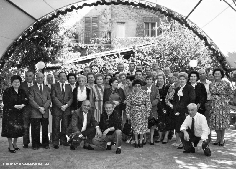 Foto ricordo degli invitati al pranzo di nozze nello spazio all'aperto del Ristorante Cannelli.