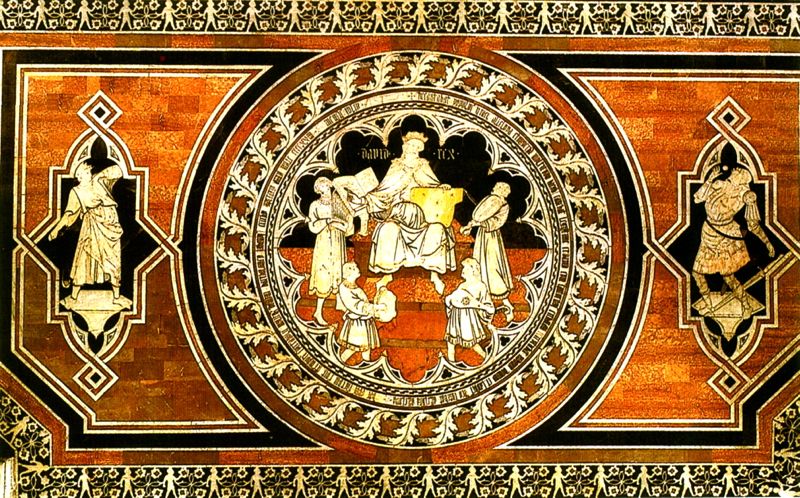 Before the step of the altar is a large tripartite panel dedicated to the figure of King David. On the sides there are two frames mixed lines in which they are representations of David who throws a stone with a sling and hit Goliath by stone thrown by David. It is curious that Goliath has a hole on his forehead, although the stone it has not yet reached and that the latter is at the same time is in the sling of David is suspended in front of Goliath. It is a contemporary representation of subsequent events, typical of medieval art. These figures, surrounded by a continuous strip that creates a complex frame characterized by a very elegant design that Roberto Longhi attributed to Jacopo della Quercia. More probably the frame was created by his pupil Domenico di Niccolò choirs. The practical realization of the inlay was made by a certain course of Sebastian from Florence with the help of the stonemason Augustine of Nicholas. At the same hand is also due to the large medallion in the center, now King David dedicated to the composition of the psalms of an open book on a lectern, accompanied by four children with musical instruments. They are symmetrically arranged on the steps around the king. Along the frame, which is decorated with trefoil arches, there is a long inscription which a hand indicates the point of beginning. All this inlay was restored in 1777 by Matteo Pini, designed by Carlo Amidei.