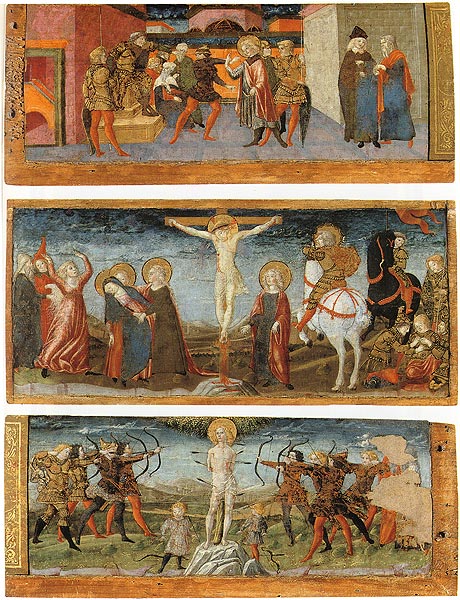 Tre Frammenti di Predella della Pala di Montisi: Processo di San Sebastiano davanti a Diocleziano; Crocifissione; Martirio di San Sebastiano