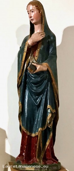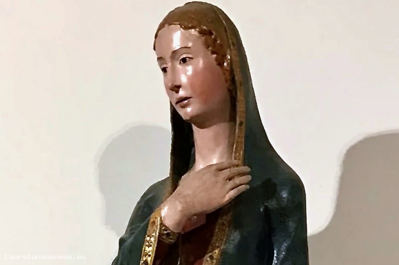 The two polychrome wooden sculptures (Angel Announcing the Virgin and Virgin Annunciate) are installed on either side of the polyptych of the Coronation of the Virgin by Bartolo di Fredi. They originally occupied the same position on the altar of the Chapel of the Annunciation in the Church of San Francesco. This is undoubtedly why they are believed to have always been part of a coherent ensemble, although the two sculptures were commissioned approximately ten years before the polyptych's completion.