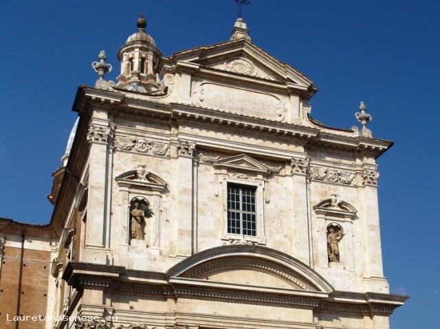 In the center, the portal is surmounted by an arched tympanum and a rectangular window, while on the sides there are four niches with statues of saints. Inside there are numerous works of art. The main altar houses the miraculous terracotta bust with the Madonna of Provenzano, surrounded by a Glory by Giovan Battista Querci.